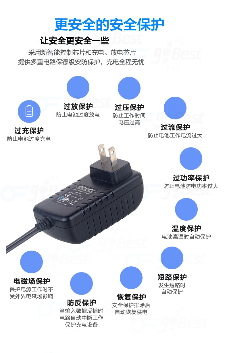 • 采用前沿IC控制方案和先進的制造工藝,高精度,低噪音;過壓,過流,過充,短路等多重保護。