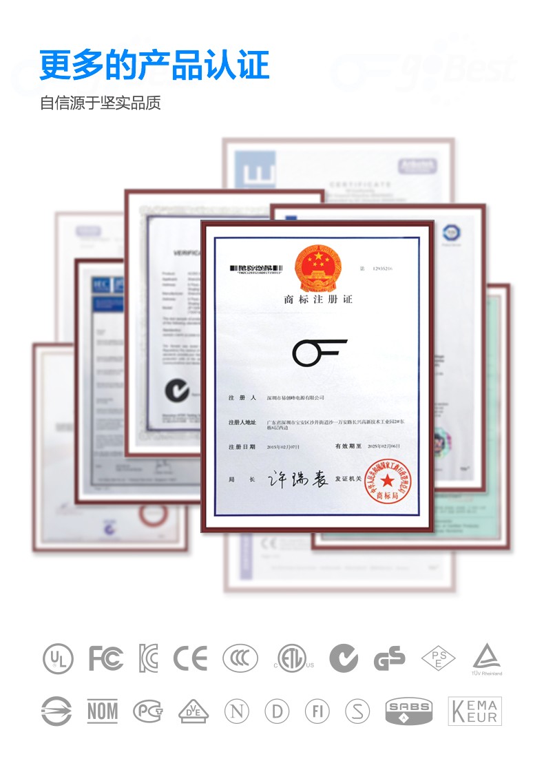 • 產品通過CCC,UL,CUL,CE,KC,GS,FCC,SAA,PSE,MEPS等安規認證.產品完全符合ROHS標準